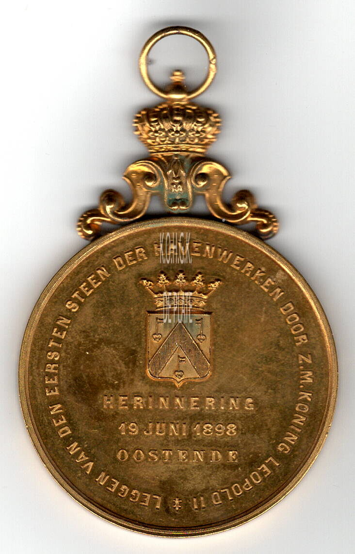 Op de keerzijde : rondom LEGGEN VAN DEN EERSTEN STEEN DER HAVENWERKEN DOOR Z.M. KONING LEOPOLD II , boven centraal het wapenschild van de stad Oostende, hieronder horizontaal HERINNERING / 19 JUNI 1898 / OOSTENDE
