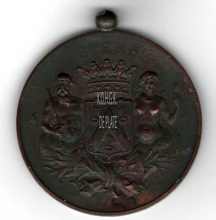 Op de voorzijde : rondom boven OSTENDE, het gekroonde wapenschild met keper en drie sleutels van de stad Oostende, geflankeerd door twee schildhouders, links meerman met zwaard naar links kijkend, rechts meermin met handspiegel naar rechts kijkend, alles geplaatst op palmbladeren samengebonden met een lint