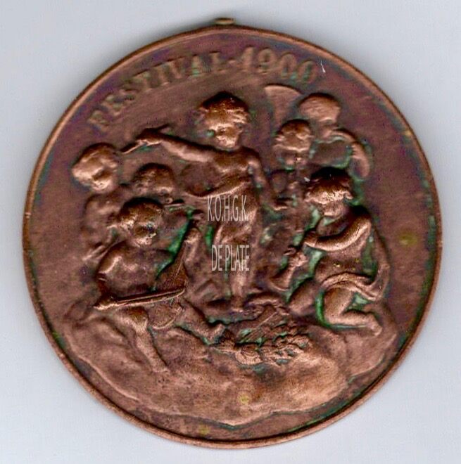 Op de keerzijde : rondom boven FESTIVAL 1900, centraal in het midden zeven musicerende putti op een wolk