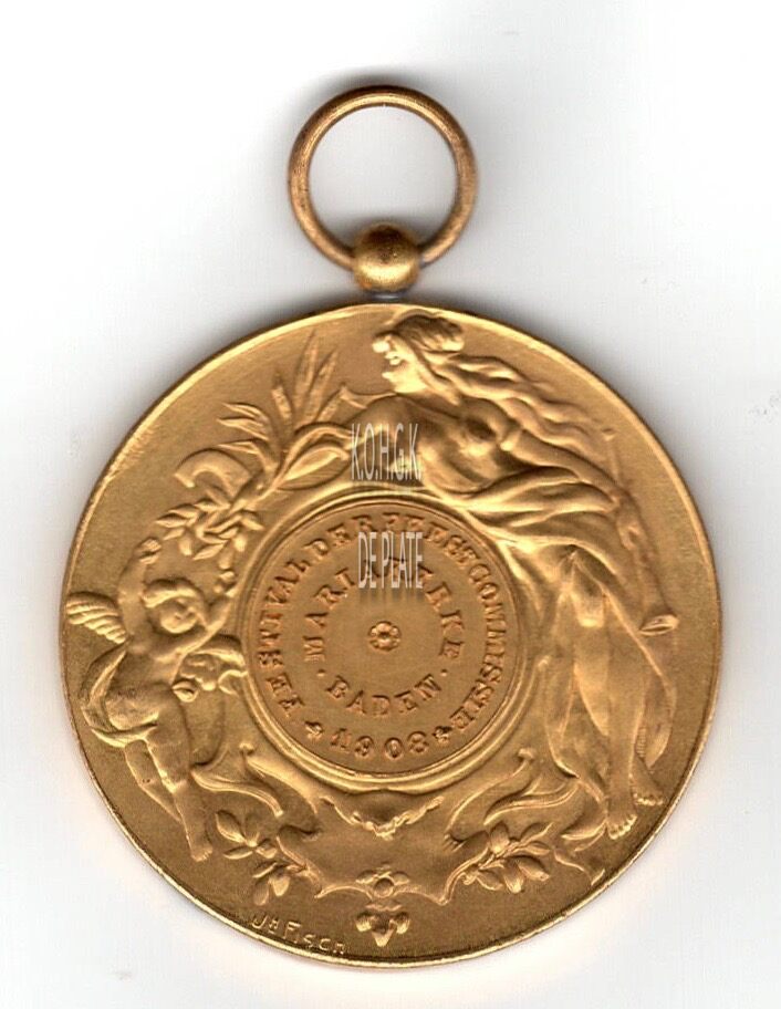 Op de keerzijde : centraal in een medaillon rondom ❃ FESTIVAL DER FEESTCOMMISSIE❃ 1908 / MARIAKERKEN BADEN, rond het medaillon Kalliope, de muze van het heldendicht, de zang, de filosofie en de retoriek met in haar linkerhand haar blazoen in de linkerhand, palm- en lauriertak in de rechterhand, links een dansende engel met opgeheven armen, onderaan links gesigneerd J. FISCH