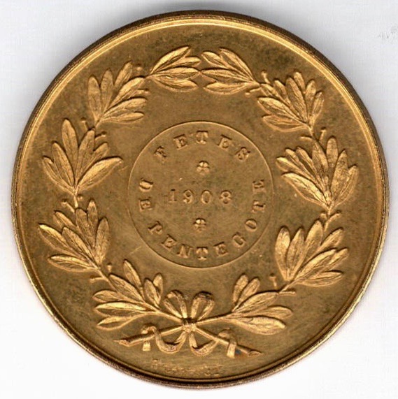 Op de keerzijde : rondom twee lauriertakken onderaan samengestrikt, centraal in een cirkel rondom boven FETES, rondom onder DE PENTECOTE, horizontaal ✿ / 1908 / ✿, onderaan 5 ingeslagen sterren
