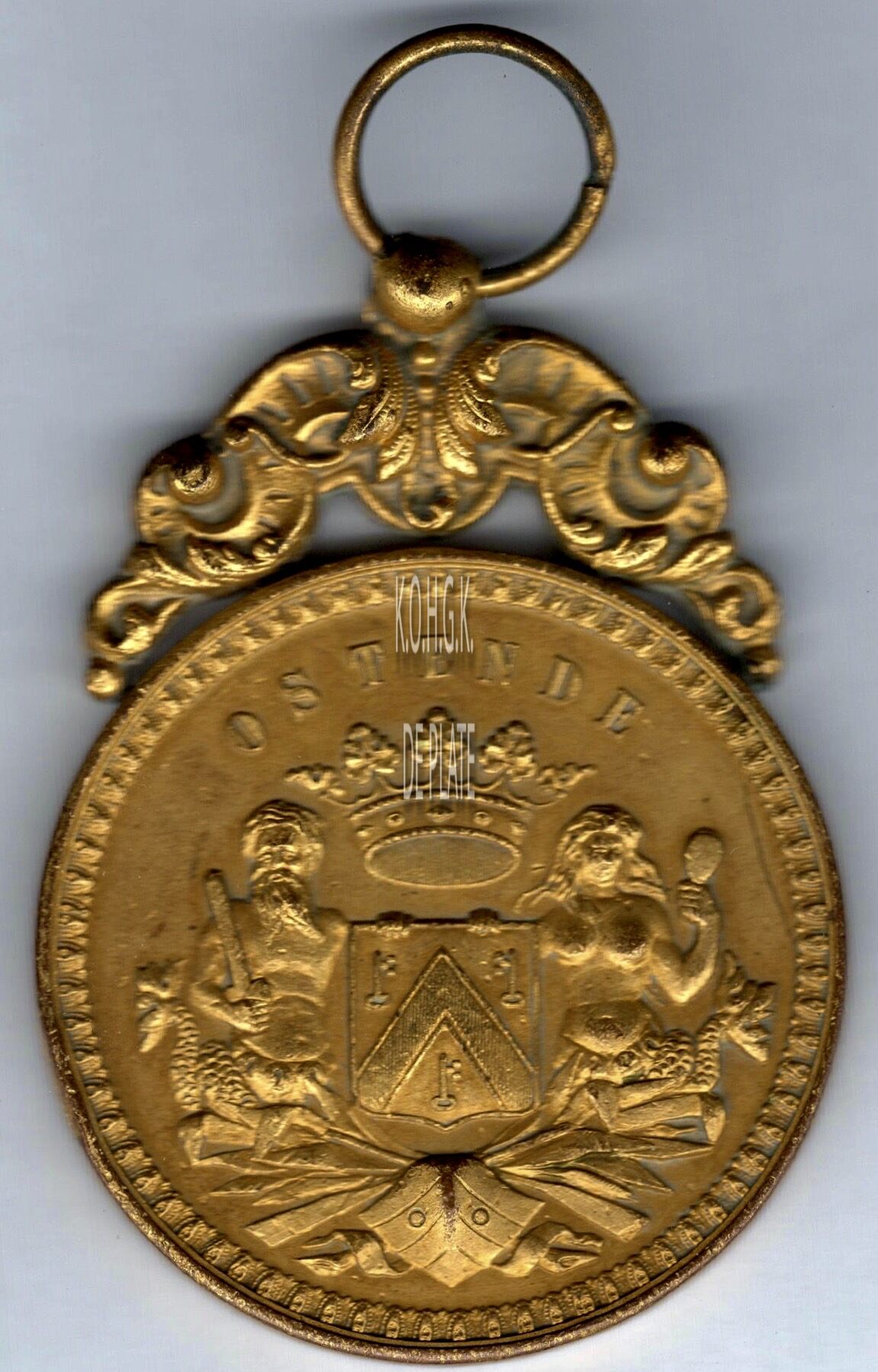 Op de voorzijde : rondom de rand een versiering, centraal het gekroonde wapenschild met keper en drie sleutels van de stad Oostende, geflankeerd door twee schildhouders, links meerman met zwaard naar links kijkend, rechts meermin met handspiegel naar rechts kijkend, geplaatst boven een boeg op zee en gevuld met palmbladeren en twee gekruiste roeispanen