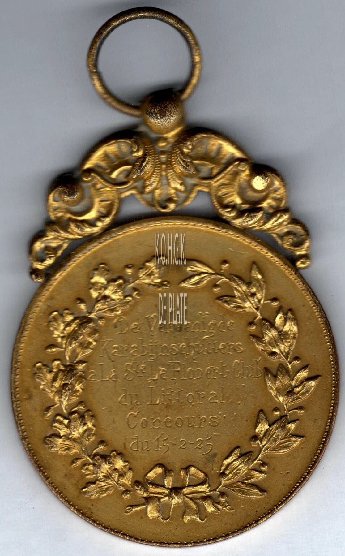 Op de keerzijde : rondom links een eikentak, rondom rechts een lauriertak onderaan samengestrikt, centraal DE VEREENIGDE / KARABIJNSCHUTERS / A LA Ste LE FLOBERT CLU / DU LITTORAL / CONCOURS / DU 15-2-25