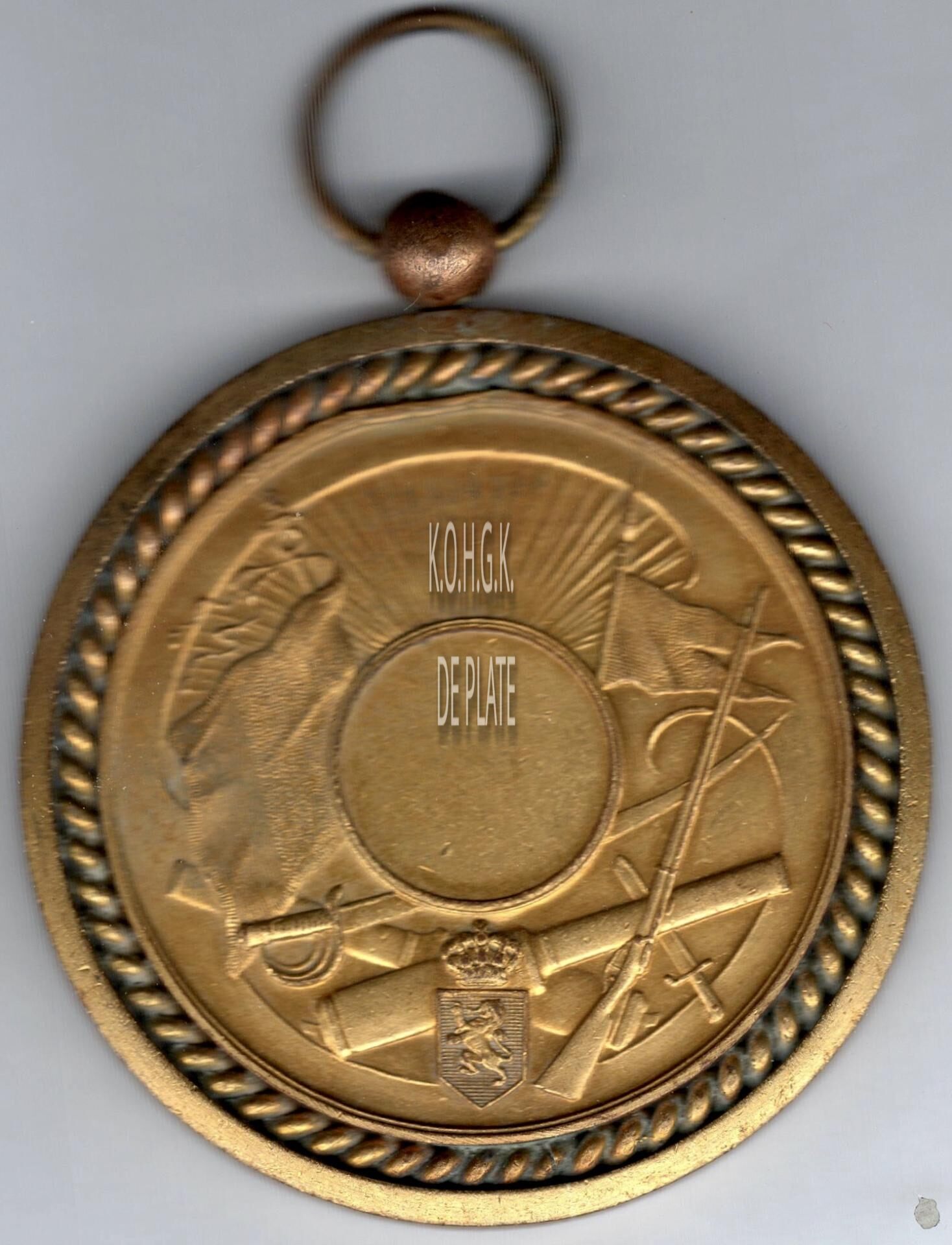 Op de voorzijde : ondom allerhande vuurwapens en vlaggen, onderaan het wapen van Belgïe