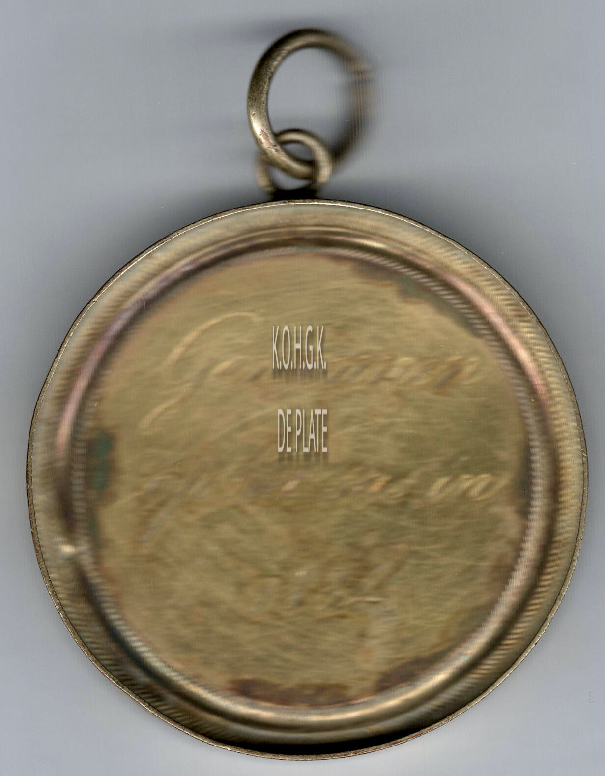 De prijspenning is rond met gladde rand in een vatting met geprofileerde parelrand met oog en draagring, en is als volgt ingegraveerd