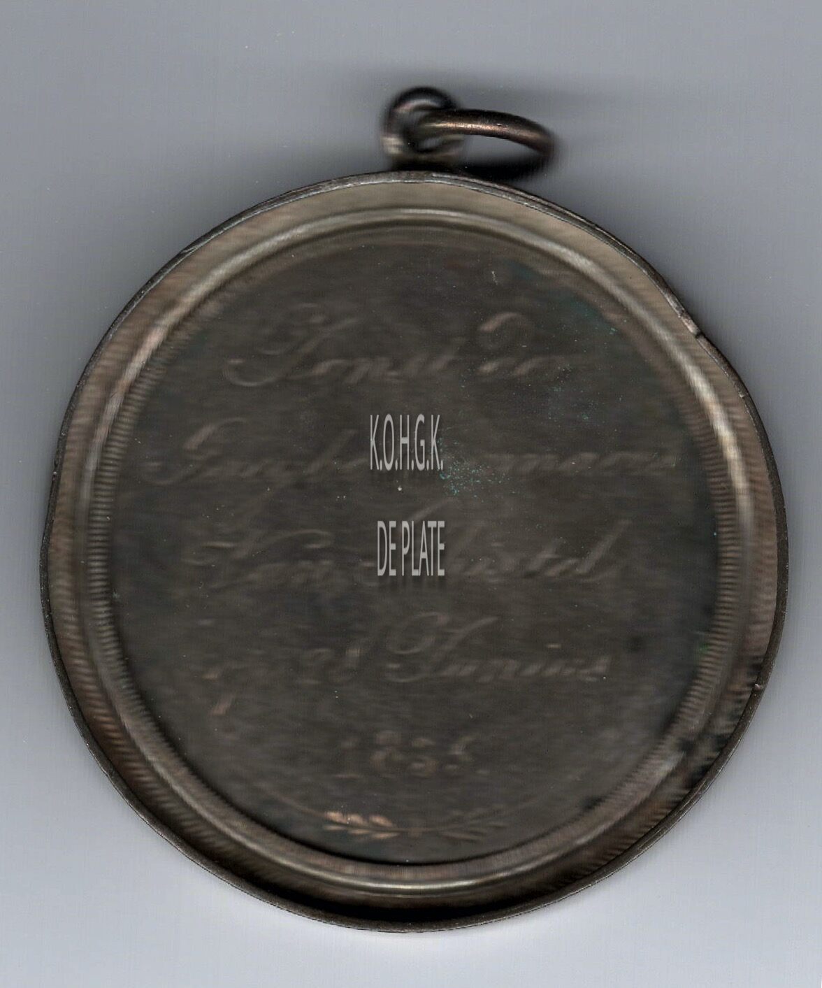 De prijspenning is rond met gladde rand in een vatting met geprofileerde parelrand, oog en ring, en is als volgt ingegraveerd