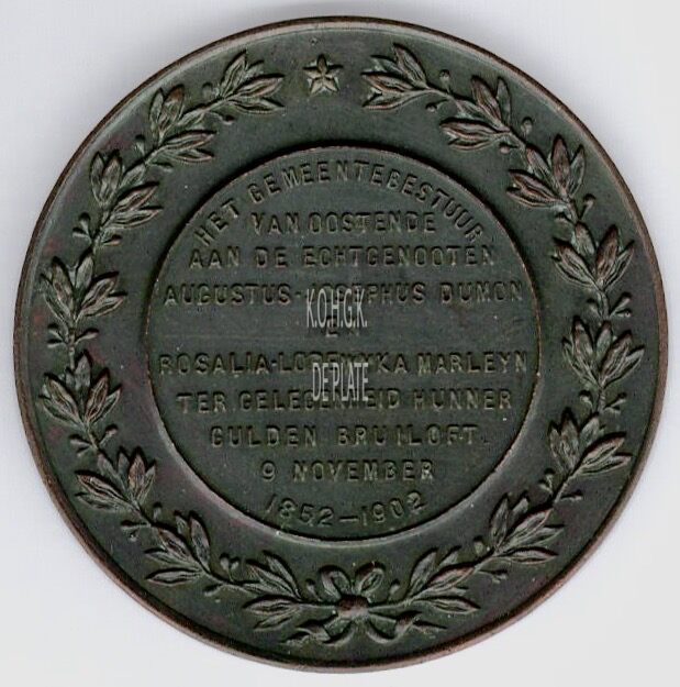 Op de keerzijde : rondom twee lauriertakken onderaan samen gestrikt, midden boven een ster, centraal  in een interne cirkel, rondom boven HET GEMEENTEBESTUUR, horizontaal VAN OOSTENDE / AAN DE ECHTEGENOOTEN / AUGUSTUS-JOSEPHUS DUMON / EN /  ROSALIA LODEWYKA MARLEYN   / TER GELEGENHEID HUNNER / GOUDEN BRUILOFT / 9 NOVEMBER, rondom onder 1852-1902
