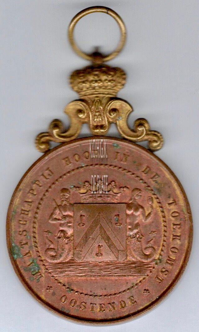 Op de voorzijde : rondom MAATSCHAPPIJ HOOP IN DE TOEKOMST ✿ OOSTENDE ✿, in een parel binnen cirkel het gekroonde wapenschild met keper en drie sleutels van de stad Oostende, geflankeerd door twee schildhouders, links meerman met zwaard naar links kijkend, rechts meermin met handspiegel naar rechts in haar spiegel kijkend, alles geplaatst boven de zee.