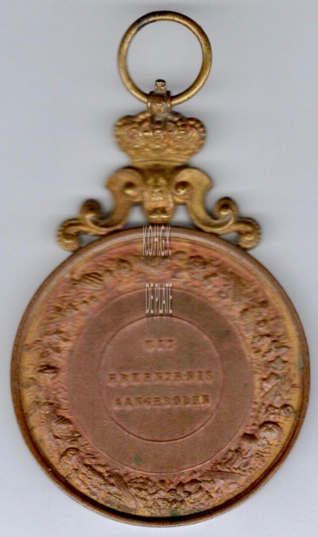 Op de keerzijde : rondom een gesloten krans van bloemen en vruchten, centraal in een binnencirkel UIT / ERKENTENIS / AANGEBODEN