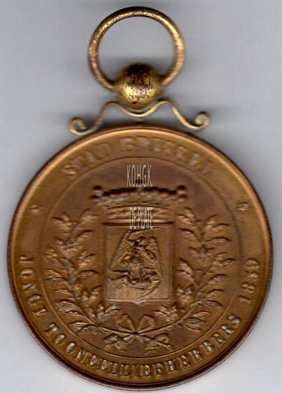 Op de voorzijde : rondom ✿ STAD BRUSSEL ✿ JONGE TOONEELLIEFHEBBERS 1859, centraal in een cirkel het gekroonde schilde van Brussel met aan beide zijden rondom een lauriertak onderaan samengestrikt.