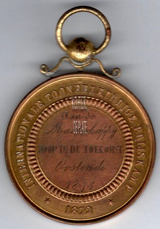 Op de keerzijde : rondom INTERNATIONALE TONEELKUNDE PRIJSKAMP ✭ 1872 ✭, in een versierde binnencirkel horizontaal AAN DE / MAATSCHAPPIJ / HOOP IN DE TOEKOMST / OOSTENDE / 1873