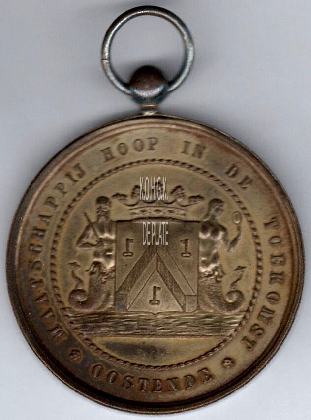 Op de voorzijde : rondom ✿ MAATSCHAPPIJ HOOP IN DE TOEKOMST ✿ OOSTENDE, centraal in een parelcirkel het gekroonde wapenschild met keper en drie sleutels van de stad Oostende, geflankeerd door twee stadshouders, links meerman met zwaard naar links kijkend, rechts meermin met handspiegel naar rechts kijkend, alles geplaatst boven de zee