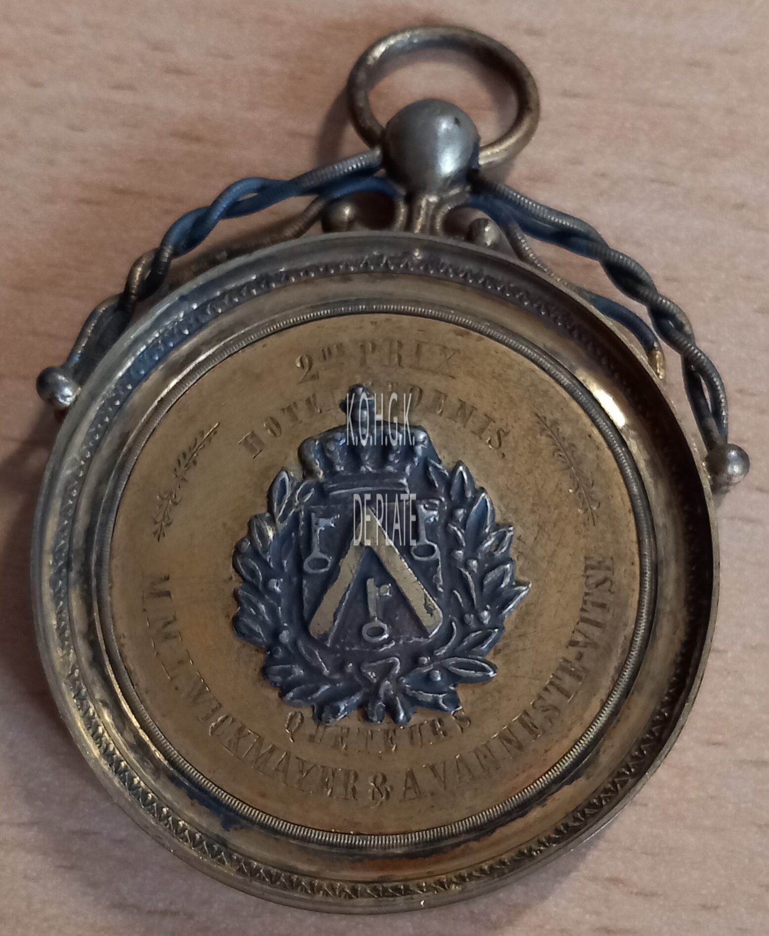 Op de voorzijde : rondom boven 2de PRIX / HOTEL DENIS, centraal het gekroonde wapenschild met keper en drie sleutels van de stad Oostende, met links en rechts een lauriertak onderaan samengestrikt, onder het schild rondom QUETEURS, rondom onder M.M.L. WICKMAYER & A. VANNESTE-VITSE