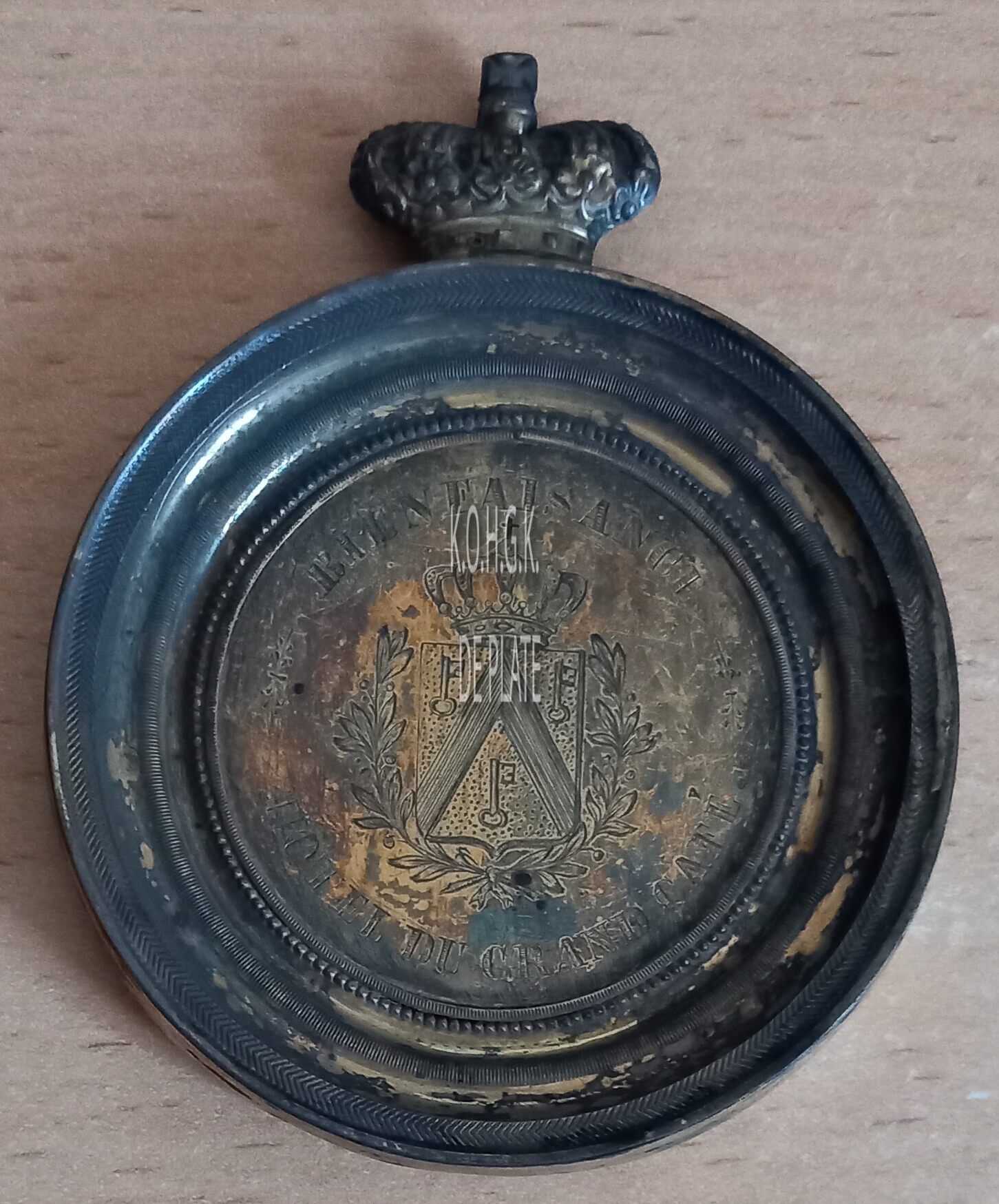 Op de voorzijde : rondom boven BIENFAISANCE, rondom onder HOTEL DU GRANDE CAFE, centraal het gekroonde schild van Oostende met aan weerszijden een lauriertak onderaan samengestrikt.