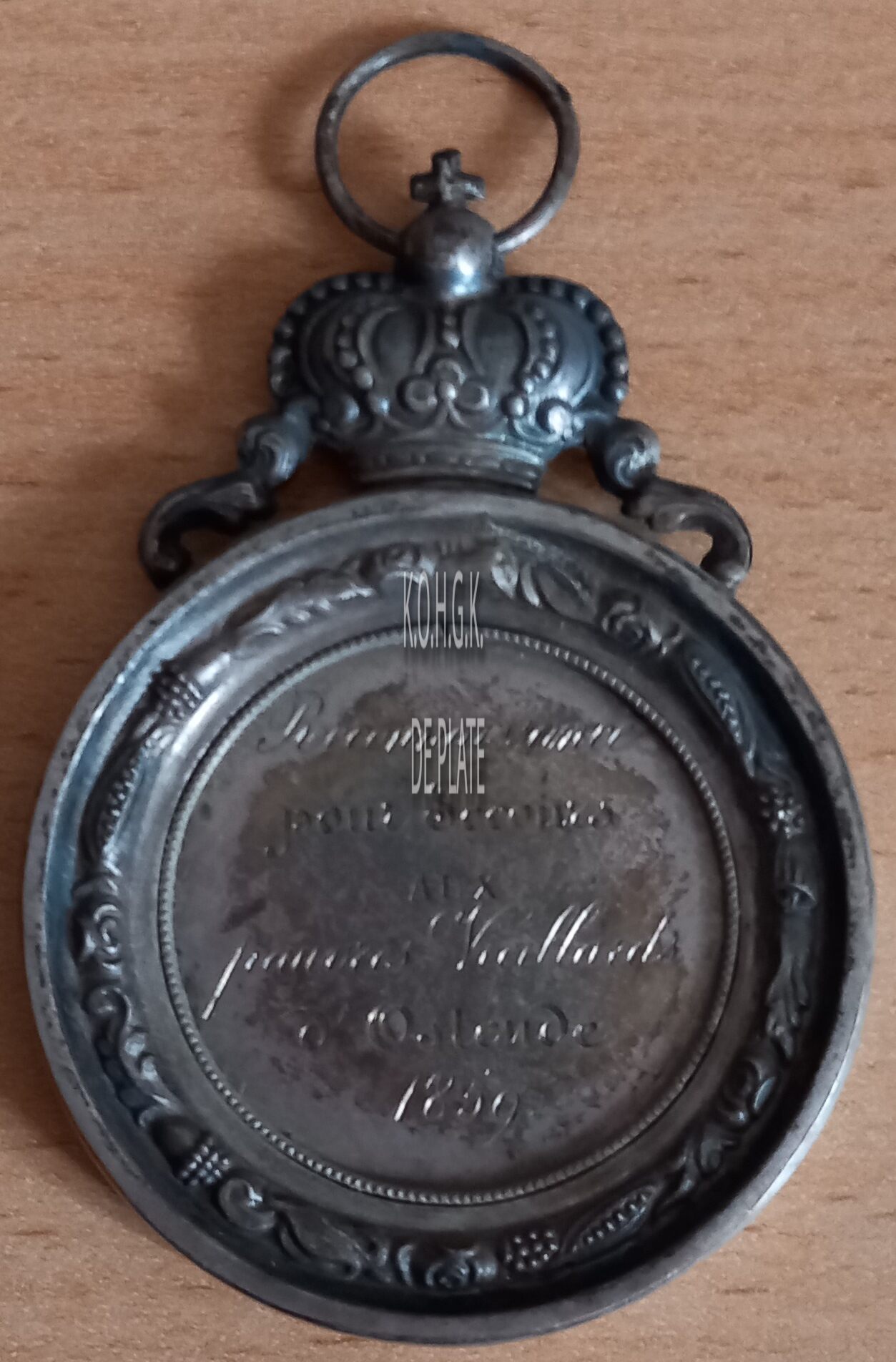 Op de keerzijde : horizontaal RECONNAISSANCE / POUR SECOURS / AUX / PAUVRES VIEILLARDS / D’ OSTENDE / 1859