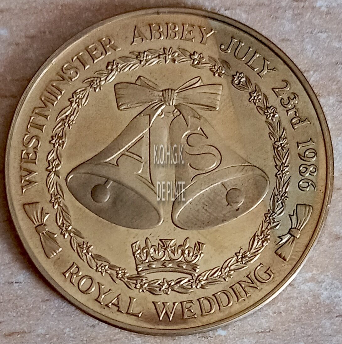 Op de keerzijde : rondom boven WESTMINISTER ABBEY JULY 23RD 1986, rondom onder ROYAL WEDDING, centraal 2 klokken met de initialen A en S met een strik samengebonden omringd door een lauwerkrans, onder de klokken een kroon
