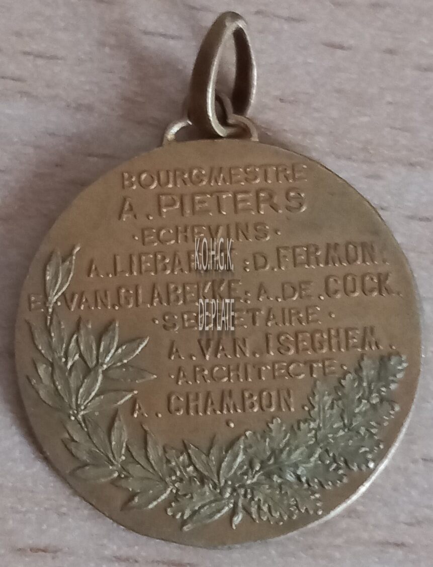 Op de keerzijde : horizontaal BOURGMESTRE / A. PIETERS / .ECHEVINS. / A. LIEBERT : D. FERMON. / E.VAN. GLABBEKE : A. DE. COCK. / .SECRETARIE. / A. VAN. ISEGHEM. / .ARCHITECTE. / A. CHAMBON, rondom links een lauriertak en rondom onder een eikentak.