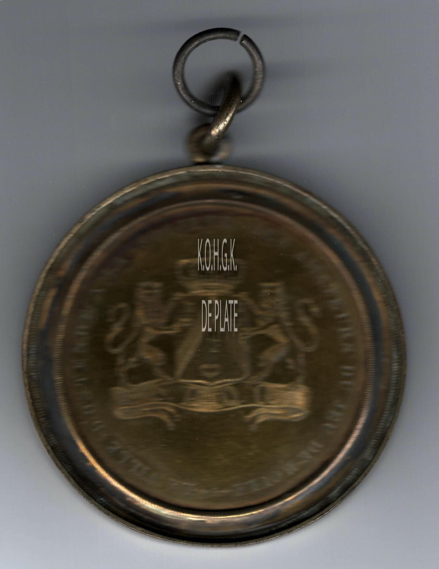 Op de voorzijde : rondom LA VILLA D’OSTENDE A LA SOCIETE DES AMATEURS DU JEU DE BOULE, centraal het gekroonde wapenschild met keper en drie sleutels van de stad Oostende, geflankeerd door twee leeuwen in vooraanzicht met daaronder een lint met S.P.Q.O.