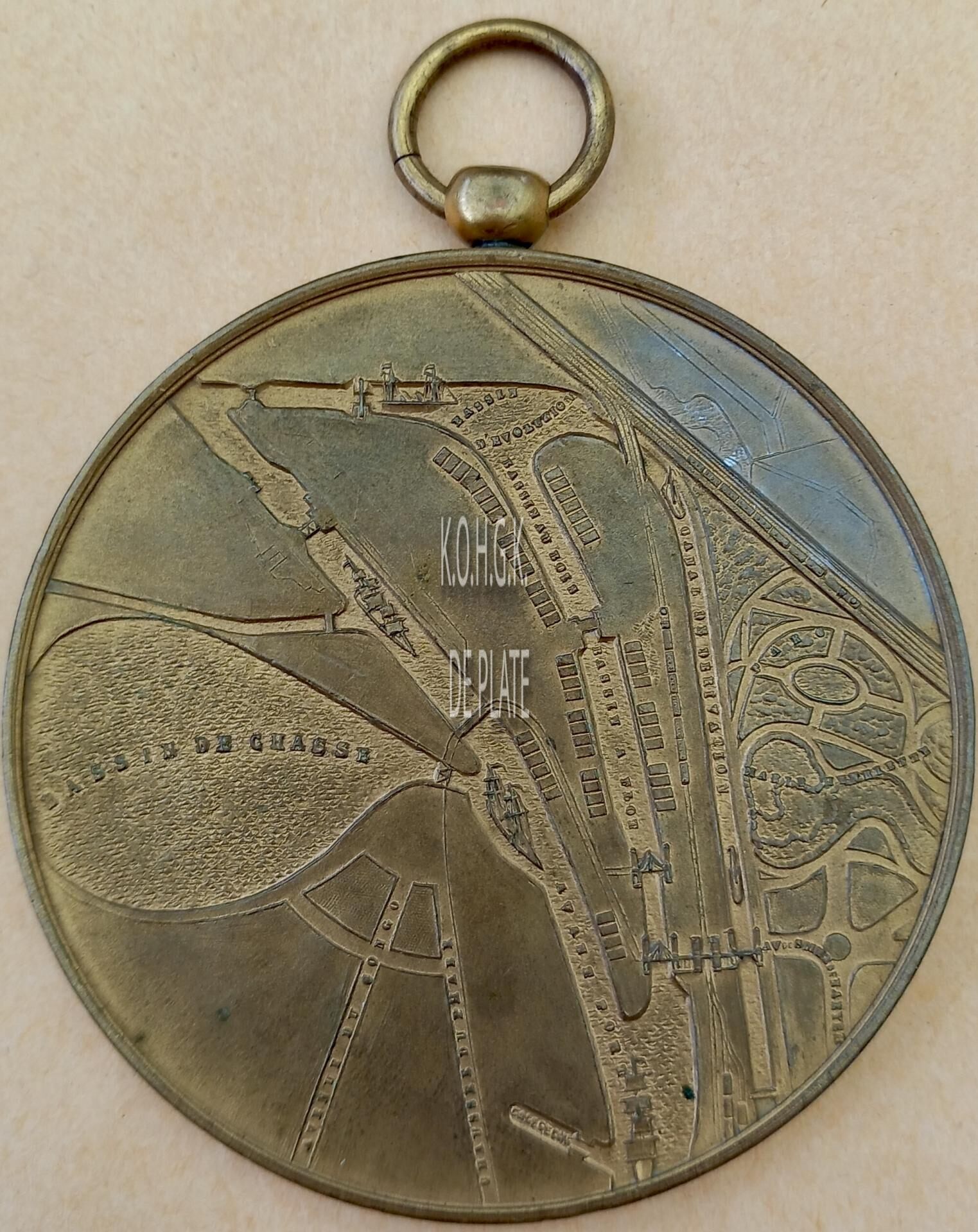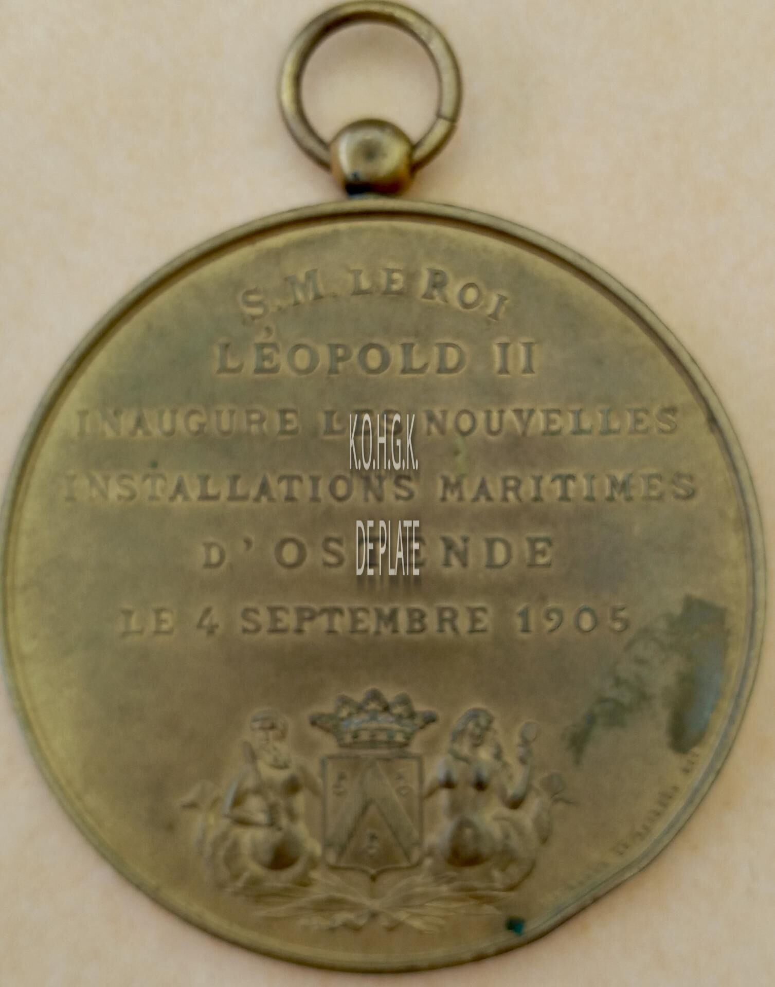 Op de keerzijde : rondom boven S.M. LE ROI, horizontaal LEOPOLD II / INAUGURE LES NOUVELLES / INSTALLATIONS MARITIEMES / D’OSTENDE / LE 4 SEPTEMBRE 1905, hieronder het gekroonde wapenschild met keper en drie sleutels van de stad Oostende, geflankeerd door twee stadshouders, links meerman met zwaard naar links kijkend, rechts meermin met handspiegel naar rechts, alles geplaatst op palmbladeren samengebonden met lint, rondom rechtsonder gesigneerd DISPERSYN ET STIENON