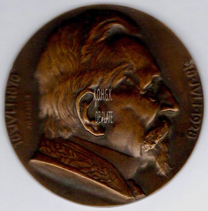 Op de voorzijde :  centraal een beeld van Jean Verhaeghe in profiel naar rechts kijkend, links rondom 18•JVLI•1878, rechts rondom 18•JVLI•1928, gesigneerd links naast het profiel JULLAGAE≠