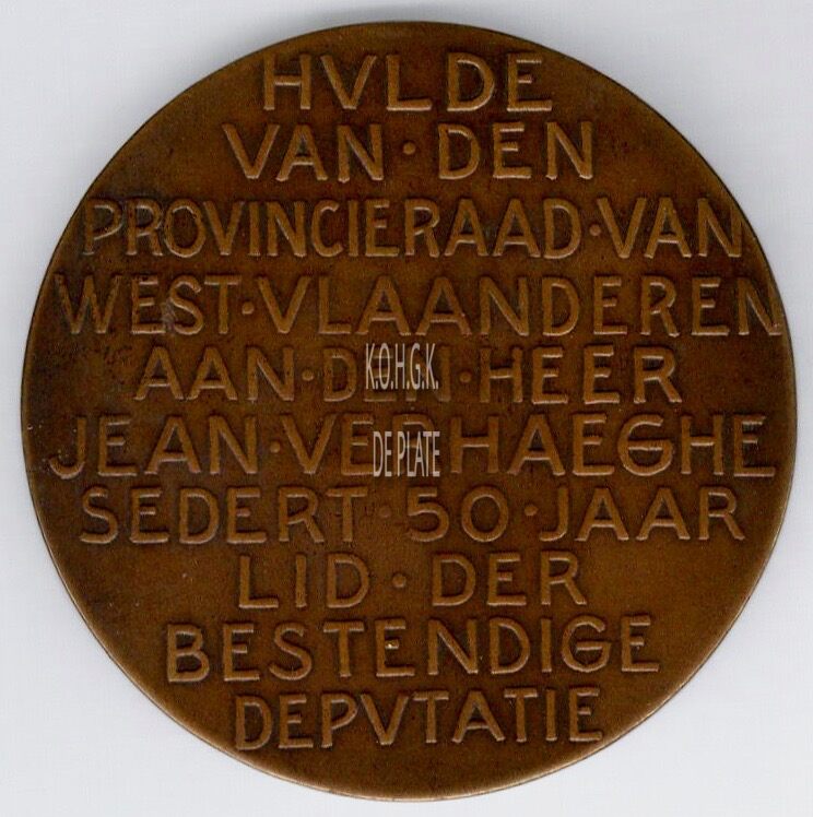 Op de keerzijde : horizontaal HVLDE / VAN• DEN / PROVINCIERAAD•VAN / WEST•VLAANDEREN / AAN•DEN•HEER / JEAN•VERHAEGHE / SEDERT•50•JAAR / LID•DER / BESTENDIGE / DEPVTATIE