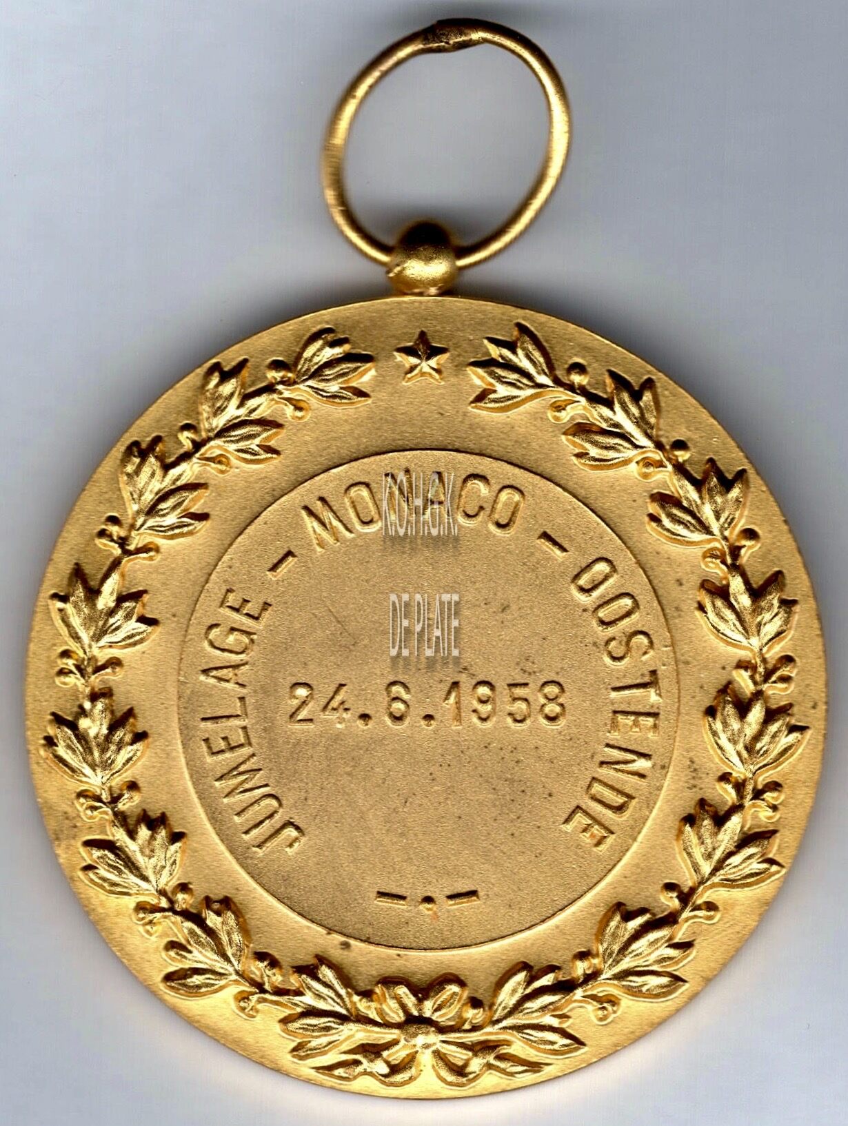 Op de keerzijde : links rondom een eikentak, rechts rondom een lauriertak beiden onderaan samengestrikt, centraal boven ✭, centraal in een binnencirkel rondom JUMELAGE – MONACO – OOSTENDE — • — , horizontaal 24.8.1958
