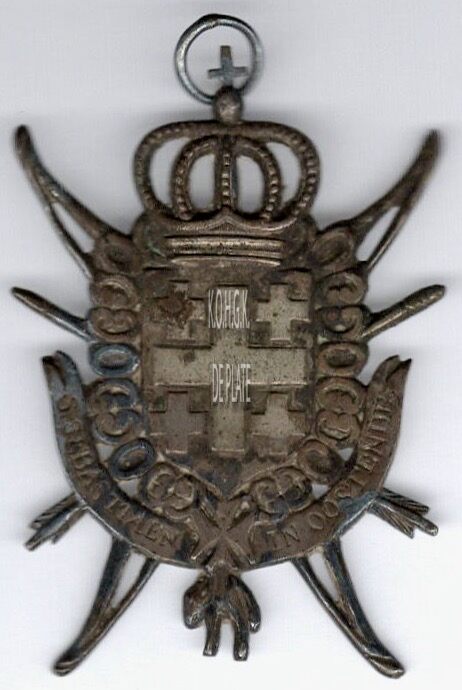 De draagpenning heeft de vorm van een schild met erboven een kroon met kruis en ring, en is als volgt ingegraveerd :