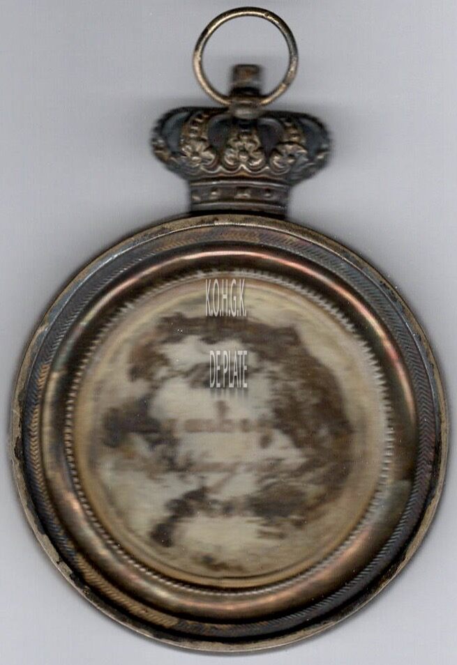 De gedenkpenning is rond met parelrand in een vatting met geprofileerde rand met kroon en ring, en is als volgt ingegraveerd