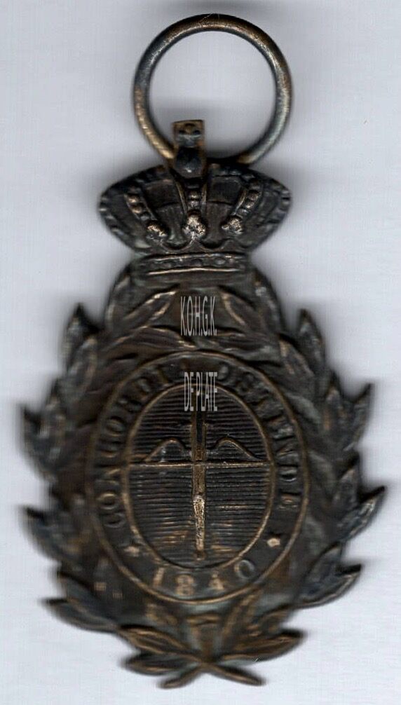 Op de voorzijde : rond de penning zitten aan weerszijden een lauriertak onderaan samengestrikt, op de penning rondom ✭ CONCORDIA OOSTENDE ✭ 1840, centraal een rechtopstaande kruisboog