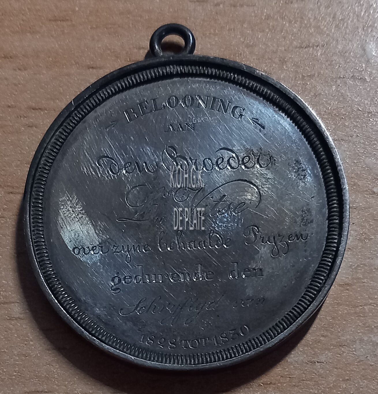 De erkentenispenning is rond met gladde geprofileerde parelrand in een vatting, met oog en is als volgt ingegraveerd: