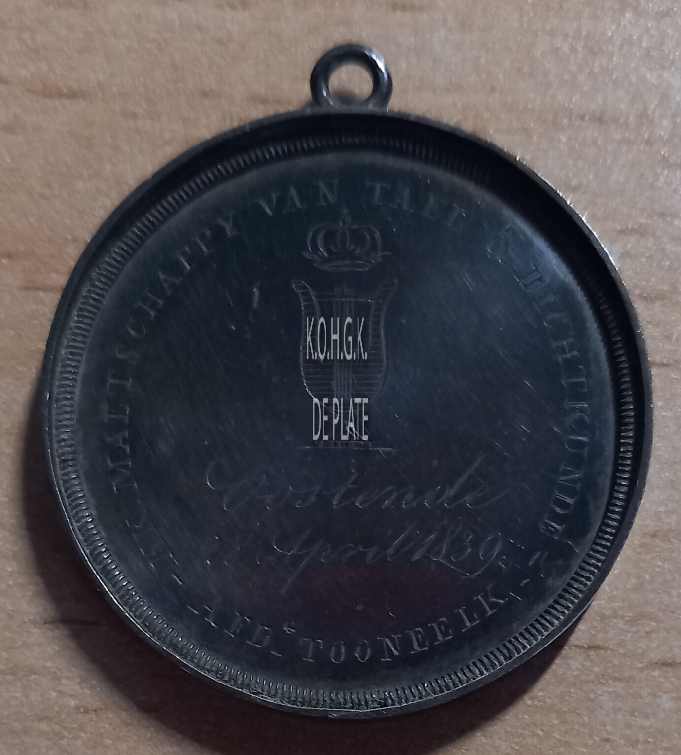 Op de voorzijde : rondom boven K.K. MAETSCHAPPY VAN VADERLANDSCHE TAEL EN DICHTKUNDE, centraal een gekroonde lier, horizontaal onder OOSTENDE / 28 APRIL 1839, rondom onder – AFD. TONEELK –