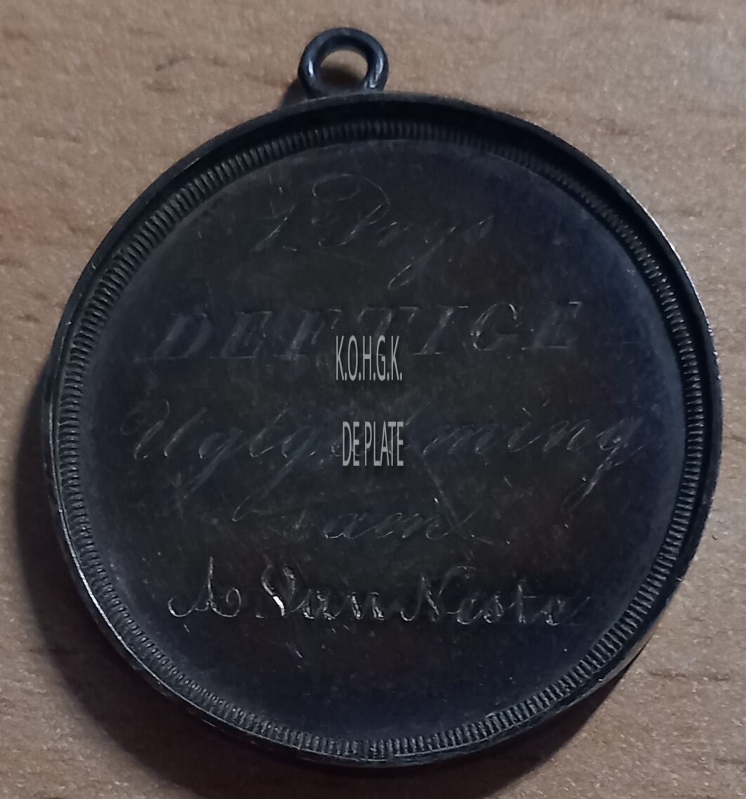 De prijspenning is rond met gladde geprofileerde streepjesranden oog, en is als volgt ingegraveerd: