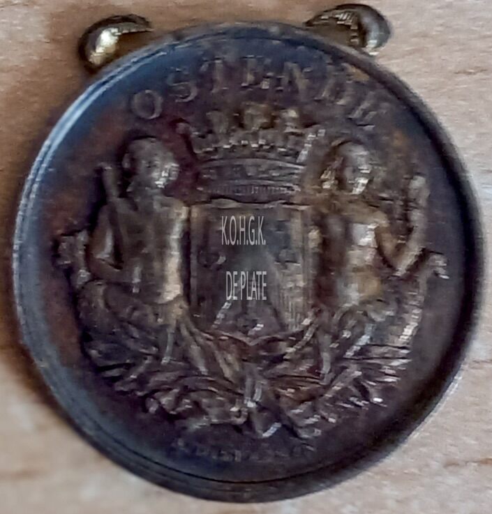 Op de voorzijde : rondom boven OSTENDE, centraal het gekroonde wapenschild met keper en drie sleutels van de stad Oostende, geflankeerd door twee schildhouders, links meerman met zwaard naar links kijkend, rechts meermin met handspiegel naar rechts kijkend, alles geplaatst op palmbladeren samengebonden met een lint, onderaan gesigneerd A. DISPERSYN