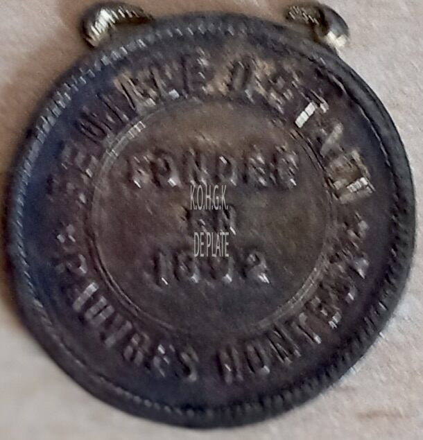 Op de keerzijde : rondom een parelrand, rondom boven ★FEUILLE D’ETAIN ★, rondom onder PAUVRES HONTEUX, centraal horizontaal in een matrijs FONDEE / EN / 1892