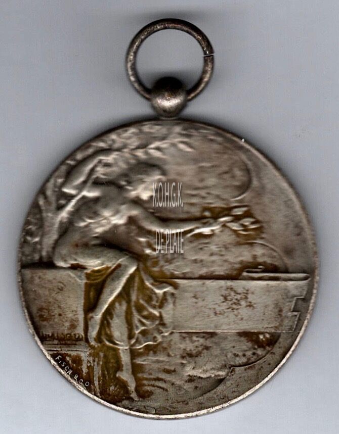 Op de voorzijde : Aan de linkerzijde een vrouw zittend op een balkon met in de linkerhand een lauriertak, zij houdt zich vast aan een boomtak, gesigneerd linksonder FISCH & C°