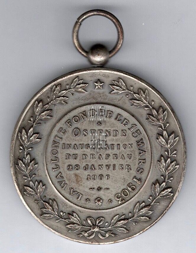 Op de keerzijde : rondom 2 lauriertakken onderaan samen gestrikt boven in het midden een ster, centraal in een medaillon rondom LA WALLONIE FONDEE LE 15 MARS 1903, horizontaal OOSTENDE / INAUGURATION / DU DRAPEAU / 28 JANVIER 1906