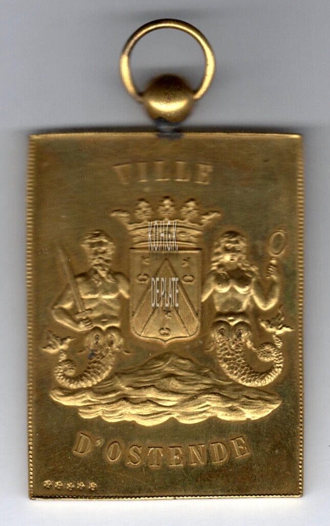Op de voorzijde : rondom een parelboord, midden boven licht gebogen VILLE, onder licht gebogen D’OSTENDE, centraal het gekroonde wapenschild met keper en drie sleutels van de stad Oostende, geflankeerd door twee schildhouders in vooraanzicht, links meerman met zwaard, rechts meermin met handspiegel alles geplaatst boven een golvende zee, onderaan links 5 ingeslagen rozen