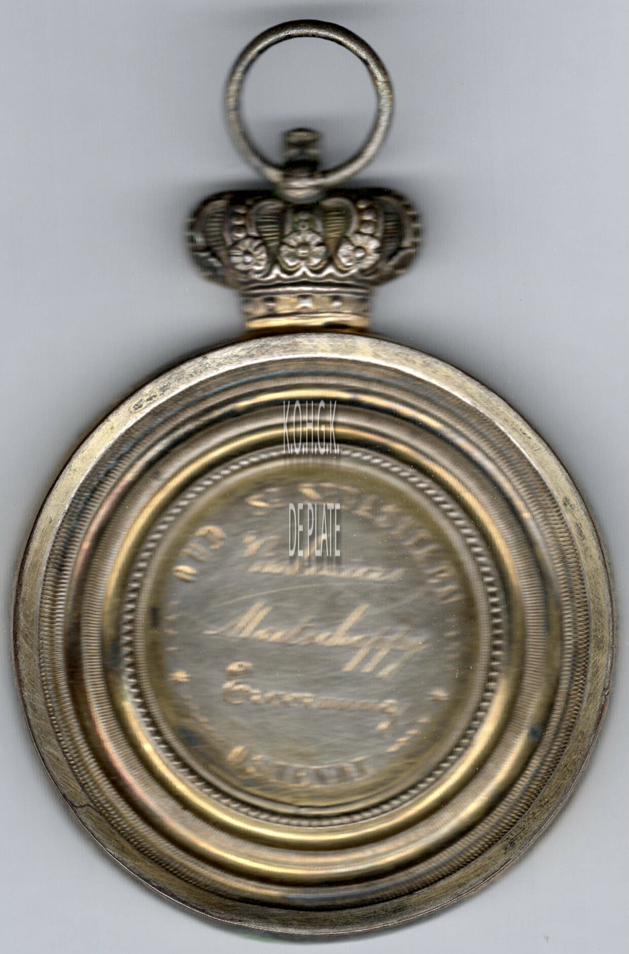 De prijspenning is rond in een vatting met gladde geprofileerde parelrand, kroon met kruis en ring, en is als volgt ingegraveerd: