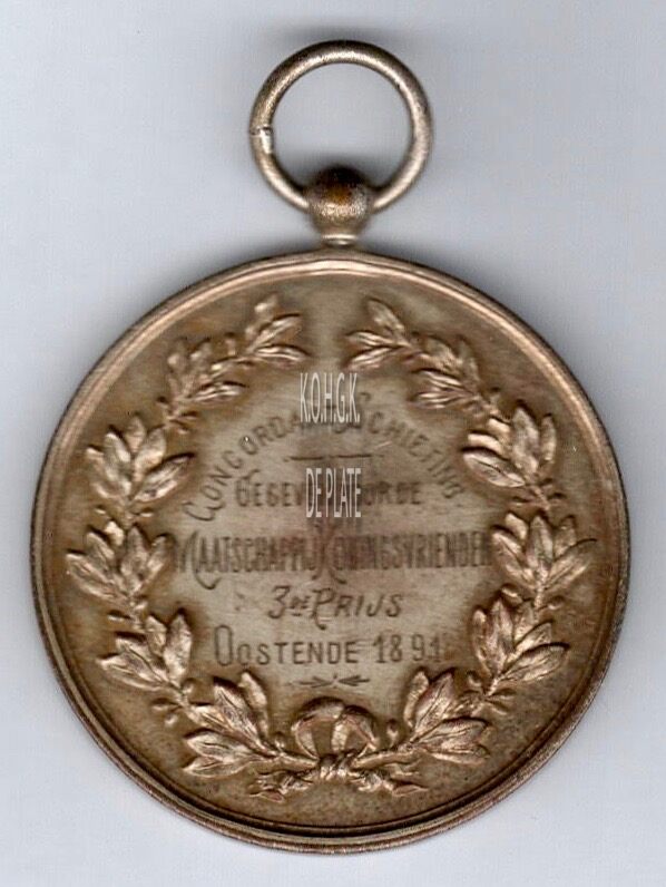 Op de keerzijde : rondom twee lauriertakken onderaan samen gestrikt, in de krans rondom boven CONCORDAAT SCHIETING, horizontaal GEGEVEN DOOR DE / MAATSCHAPPIJ KONINGSVRIENDEN / 3E RPIJS / OOSTENDE 1891