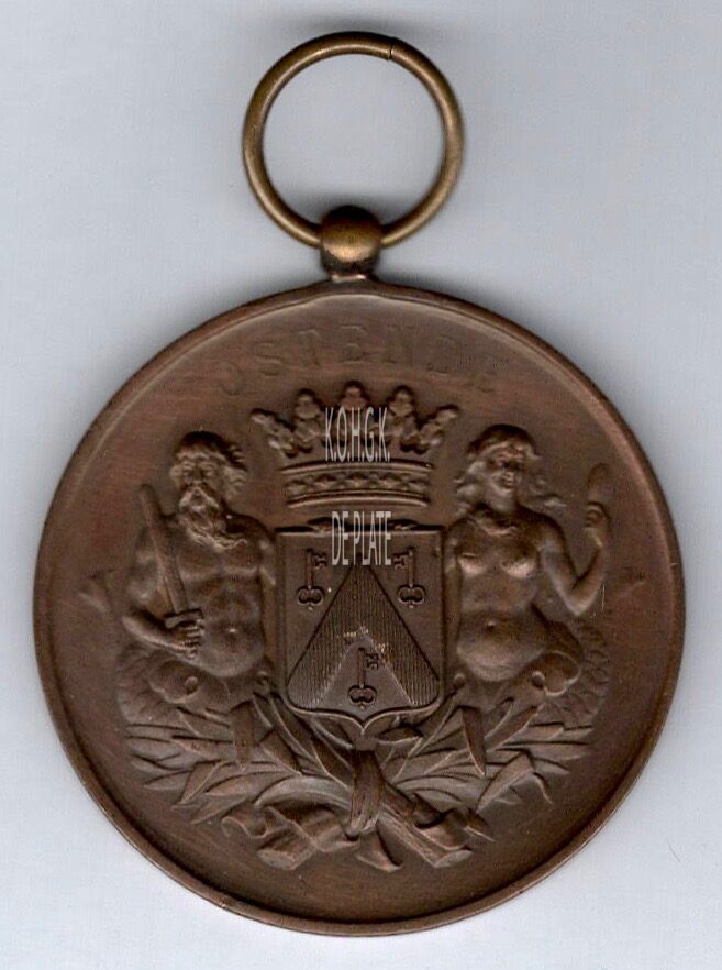 Op de voorzijde : rondom boven OSTENDE, het gekroonde wapenschild met keper en drie sleutels van de stad Oostende, geflankeerd door twee schildhouders, links meerman met zwaard naar links kijkend, rechts meermin met handspiegel naar rechts, alles geplaatst op palmbladeren samengebonden met lint
