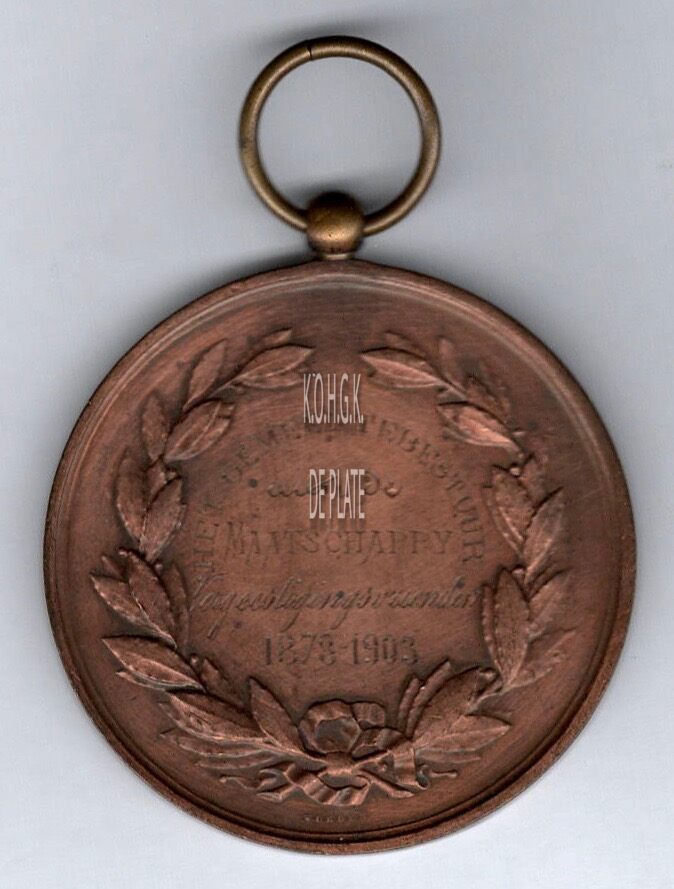 Op de keerzijde : rondom twee lauriertakken onderaan samen gestrikt, in de krans rondom boven HET GEMEENTEBESTUUR, horizontaal AAN DE / MAATSCHAPPY / VERGEESTIGINGSVRIENDEN / 1878-1903, gesigneerd onder de strik WURDEN