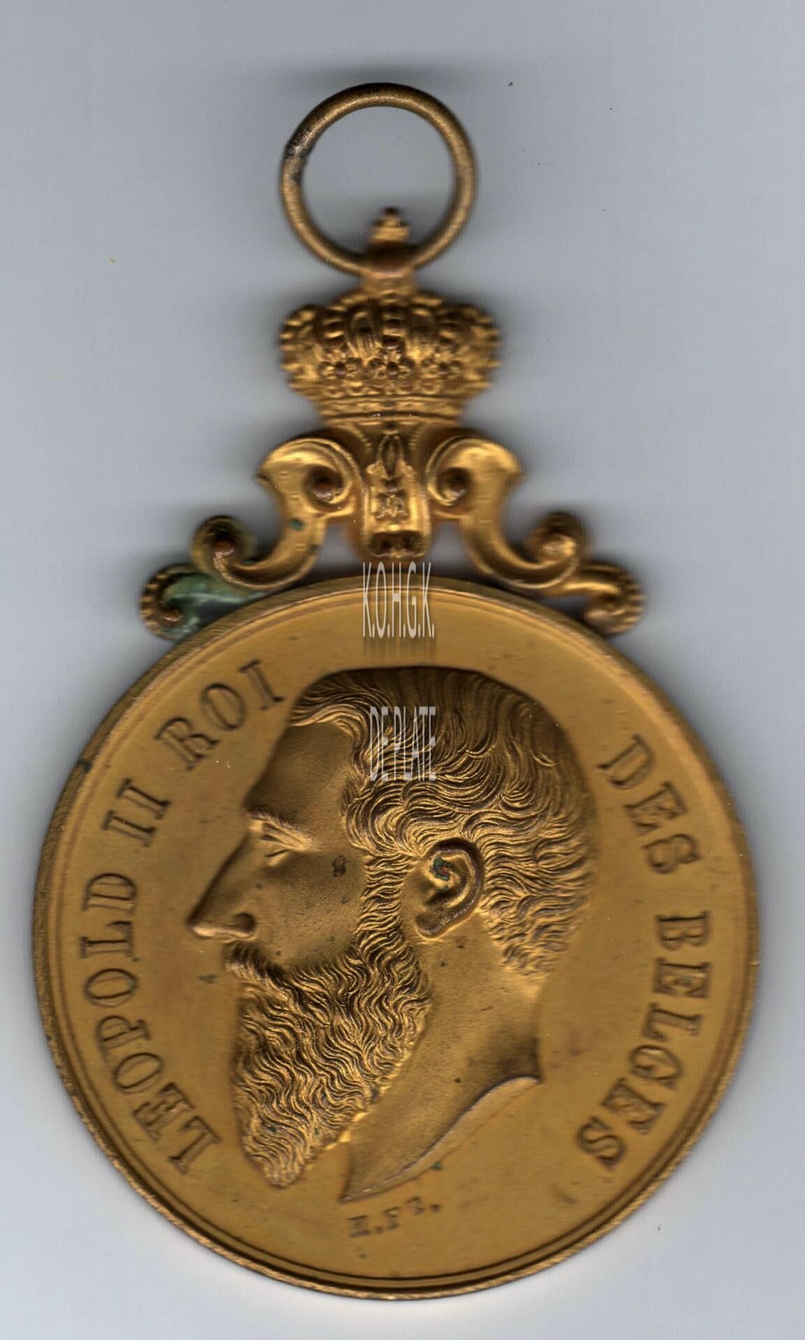 Op de voorzijde : rondom links LEOPOLD II ROI, rondom rechts DES BELGES, centraal het hoofd van koning Leopold II in profiel naar links gericht, midden onder gesigneerd H.F.T.