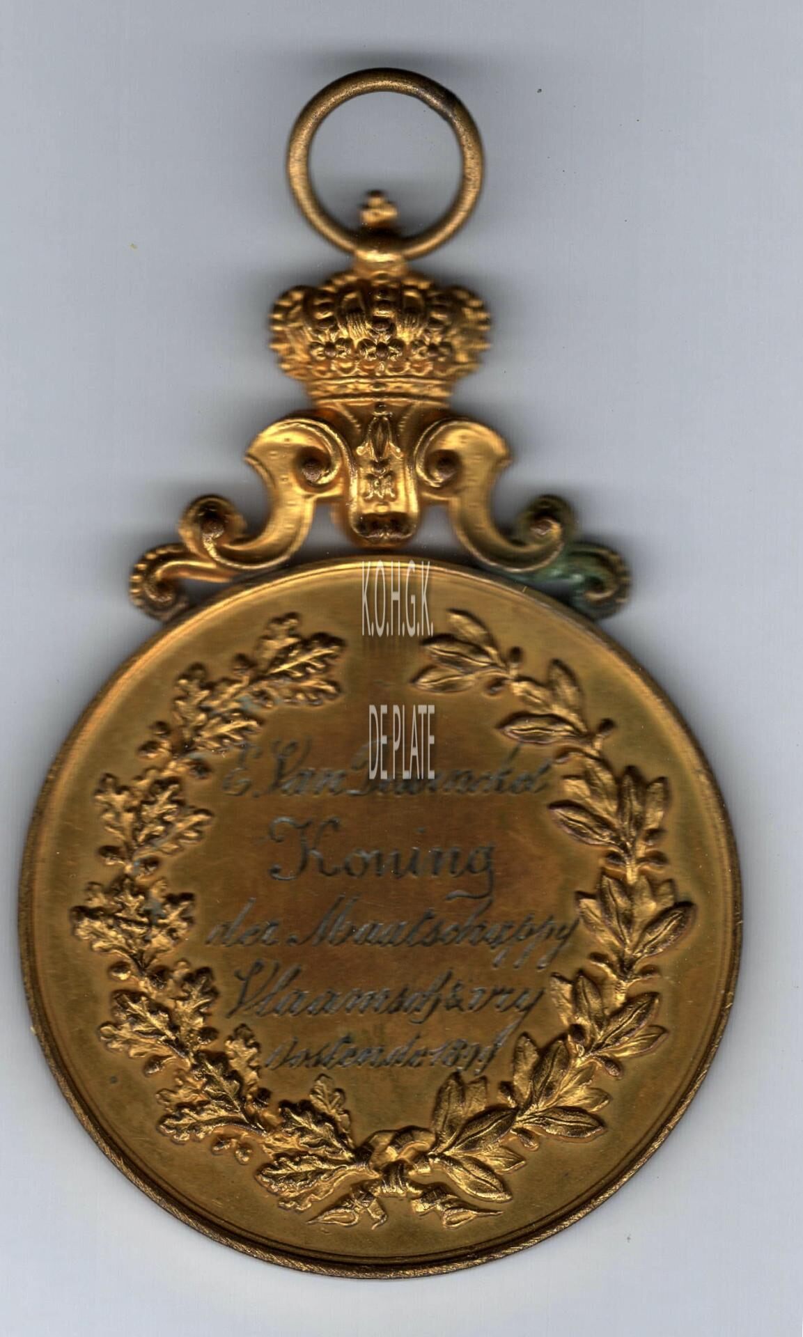 Op de keerzijde : rondom links een eikentak, rechts een lauriertak onderaan samengestrikt, centraal horizontaal E. VANDEWINCKEL / KONING / DER MAATSCHAPPY / VLAAMSCH EN VRIJ / OOSTENDE 1899