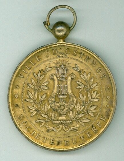 Op de voorzijde : rondom ❃❃❃ VILLE D’OSTENDE ❃❃❃ SOCIETE EUTERPE, centraal in een parelcirkel een lier met aan beide zijden een lauriertak onderaan samen gestrikt, midden boven een stralende ster, gesigneerd onder de lauwerkrants A.FISCH