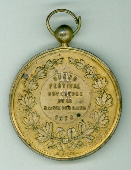 Op de keerzijde een open eikentak (rechts) en een lauriertak (links) beide onderaan samen gestrikt, midden onder gesigneerd A. FISCH, centraal in een medailllon GRAND / FESTIVAL / OUVERTURE / DE LA / SAISON DES BAINS / 1876