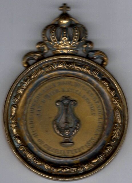 Op de voorzijde : rondom een versierde rand, daarnaast rondom boven eerste rij HULDE • OPGEDRAGEN DOOR DE WERKENDE LEDEN, tweede rij AAN D’HEER KAREL DESMET, rondom onder • OP COECILIAFEEST 1873 •, centraal een rechtopstaande lier