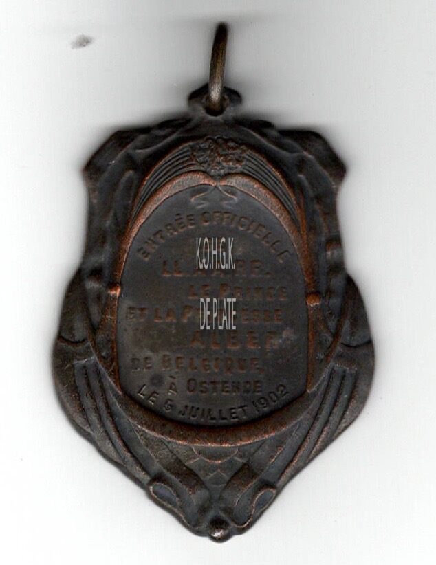 Op de keerzijde :, horizontaal de tekst boven rondom ENTREE OFFICIELE, horizontaal DE / LL. AA. RR. / LE PRINCE / ET LA PRINCESSE / ALBERT / DE BELGIQUE / A OSTENDE, rondom onder LE 5 JUILLET 1902 in een ovalen lijst met bovenaan een bloementuil