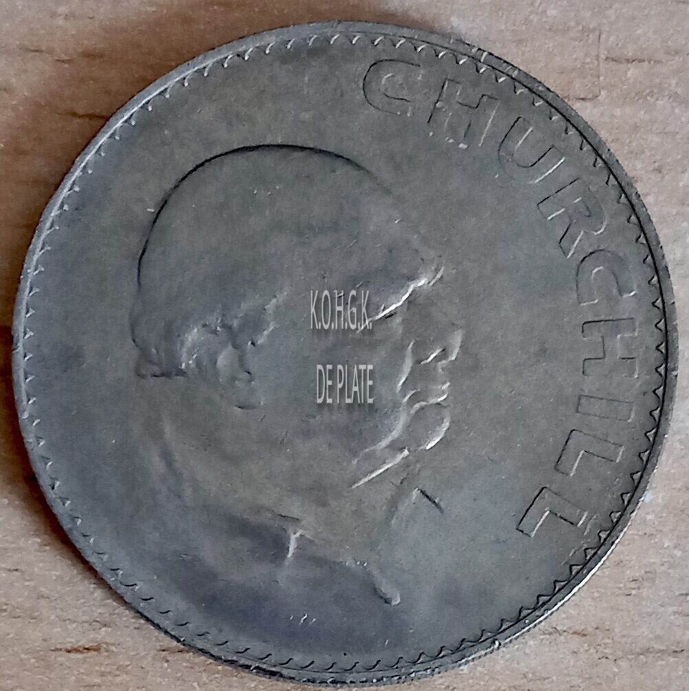 Op de voorzijde : tegen de buitenrand rondom een sierrand, rondom rechts CHURCHILL, centraal het hoofd van Winston Churchill naar rechts gericht.
