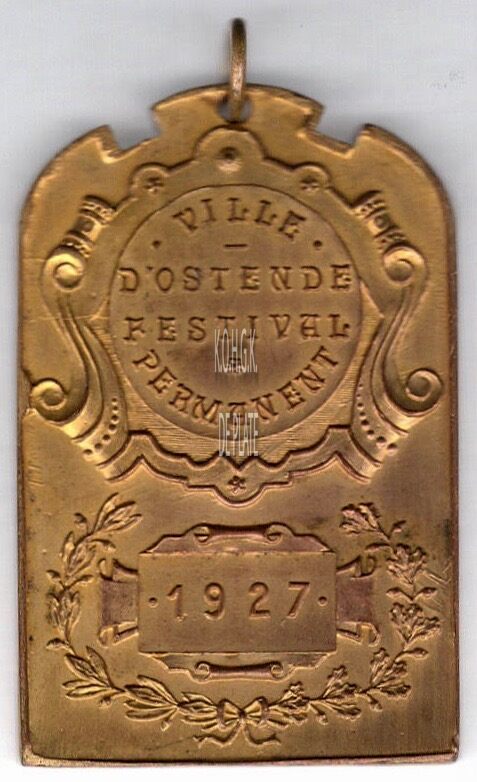 Op de keerzijde : centraal in het bovenste gedeelte een medaille met een binnencirkel, rondom boven • VILLE • , horizontaal — / D’OSTENDE / FESTIVAL / ✿, rondom onder PERMANENT, in het onderste gedeelte links een lauriertak, rechts een eikentak onderaan samengestrikt, centraal in de open krans een graveerd plaket met daarin • 1927 •