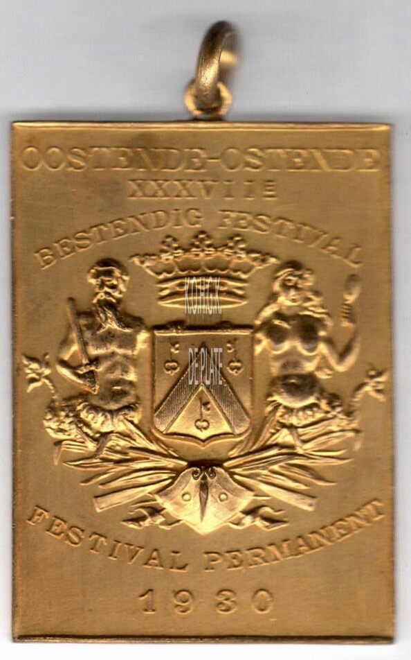 Op de keerzijde : boven horizontaal OOSTENDE – OSTENDE / XXXVIIe, rondom BESTENDIG FESTIVAL, centraal in het midden het gekroonde wapenschild met keper en drie sleutels van de stad Oostende, geflankeerd door twee schildhouders, links meerman met zwaard naar links kijkend, rechts meermin met handspiegel naar rechts kijkend, geplaatst boven een boeg op zee en gevuld metpalmbladeren en twee gekruiste roeispanen , onder rondom FESTIVAL PERMANENT, horizontaal 1930